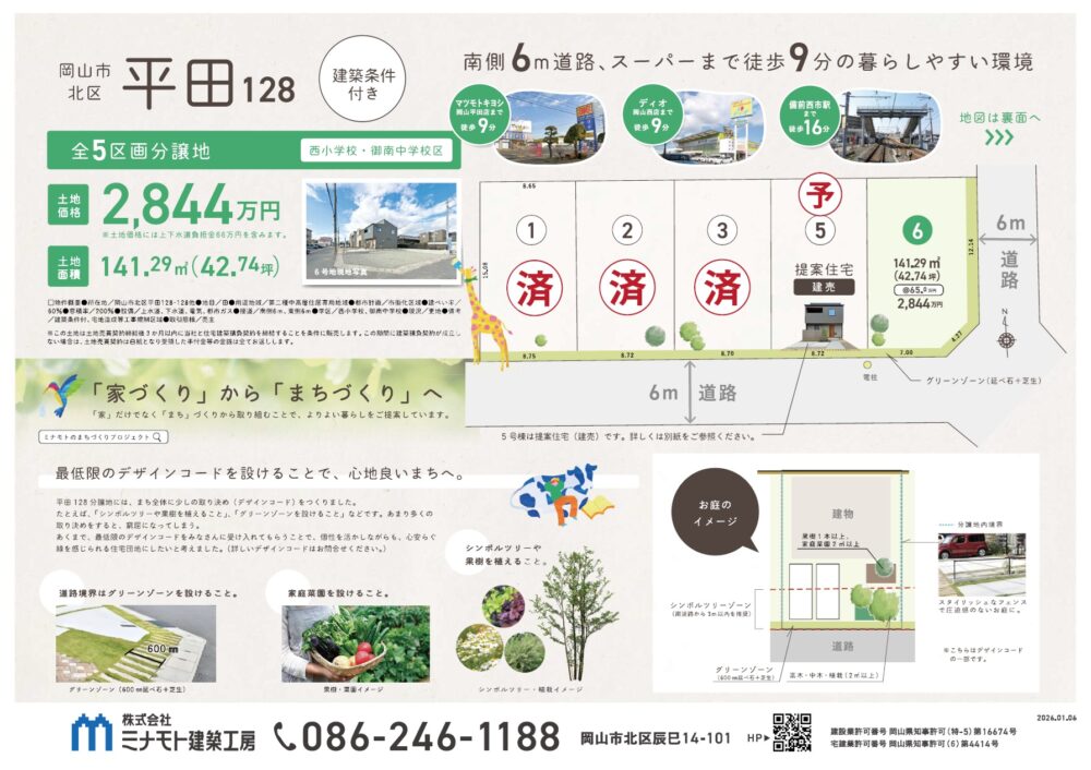 | 備考 | ※宅地造成等工事規制区域 【最低限のデザインコードを設けることで、心地良いまちへ】 こちらの分譲地には、まち全体に少しの取り決め(デザインコード) をつくりました。 例えば、「シンボルツリーや果樹を植えること」、「グリーンゾーンを設けること」などです。最低限のデザインコードをみなさんに受け入れてもらうことで、個性を活かしながらも、心安らぐ緑を感じられる住宅団地にしたいと考えました。(詳しいデザインコードはお問合せください。) ▶もっと詳しく【まちづくりプロジェクト】 ------------ 現地から徒歩1分の場所に、以前手がけた弊社分譲地もございます。街並みの雰囲気等、ご覧になりたい方は、お気軽にご連絡ください。 ------------ ↓同分譲地内、5号地は提案住宅です。詳しくは下記ページへ |