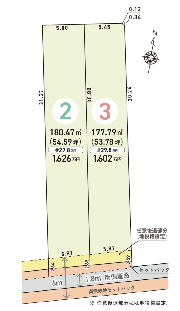| 備考 | ※建築条件なし ・任意後退部分には地役権設定。 ▼建物参考プランの詳細はPDFチラシをご覧ください。 |
