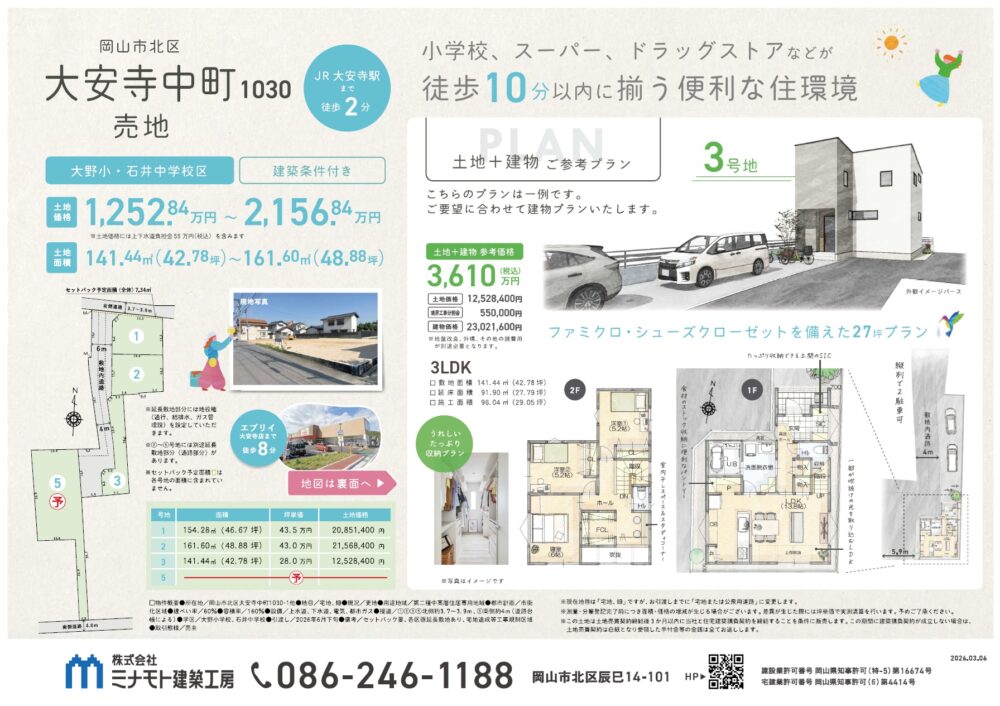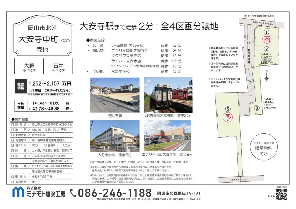 | 備考 | ※建築条件付き ※令和8年6月下旬のお引渡しです。 ※延長敷地部分には地役権(通行、給排水、ガス管埋設)を設定していただきます。 ※②~⑤号地には別途延長敷地部分(通路部分)があります。 ※セットバック予定面積は各号地の面積に含まれていません。 ※現在地目は「宅地、畑」ですが、お引渡しまでに「宅地または公衆用道路」に変更します。 ※測量・分筆登記完了前につき面積・価格の増減が生じる場合がございます。差異が生じた際には坪単価で実測清算を行います。予めご了承ください。 ----- ■JR大安寺駅まで徒歩2分 ■エブリイ岡山大安寺店まで徒歩8分 ■ザグザグ大安寺店まで徒歩9分 ■ラ・ムー大安寺店まで徒歩13分 ■セブンイレブン岡山野殿東町店まで徒歩8分 ■大野小学校まで徒歩5分 |