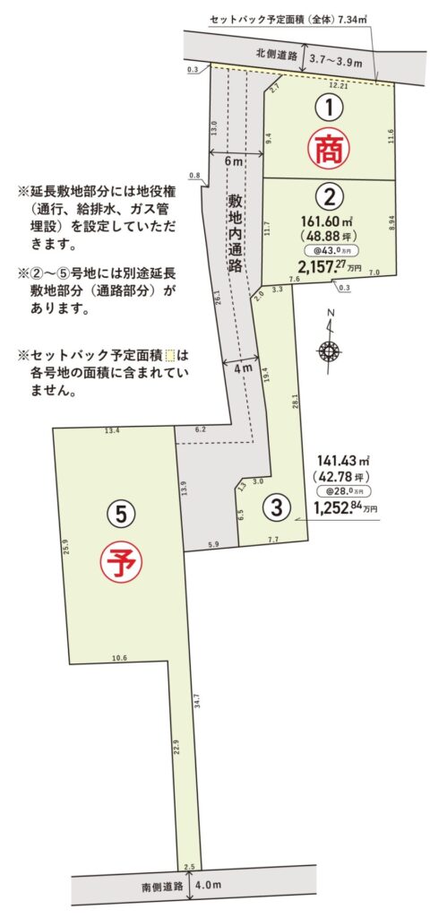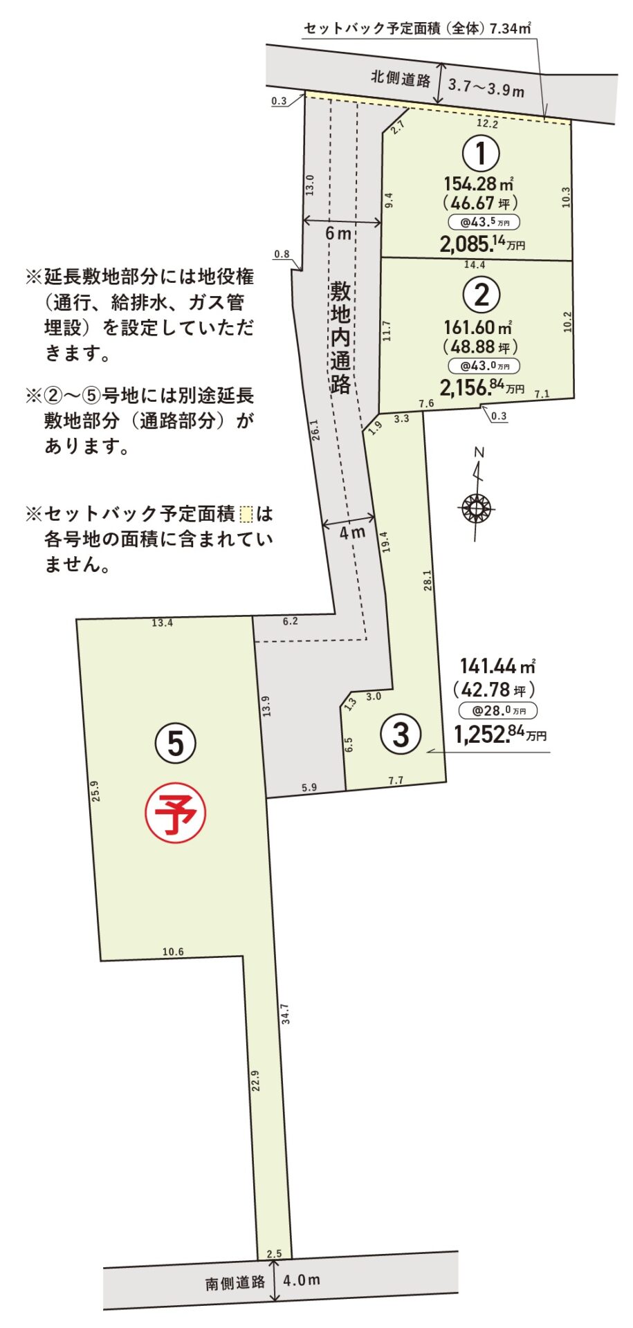 | 設備 | 上水道、下水道、電気、都市ガス | 道路 | ①②③⑤北側約3.7~3.9m(セットバック要)、⑤南側約4m(道路台帳による) |