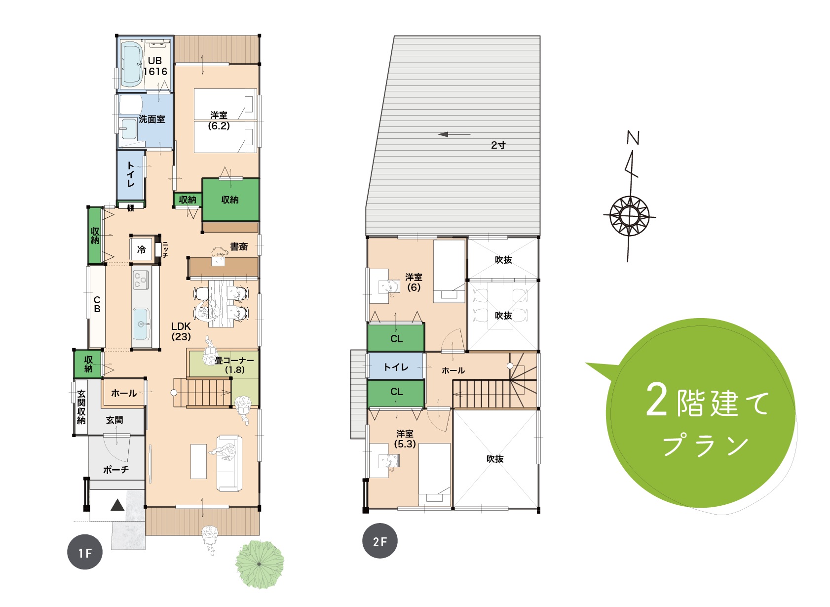 【2階建て/参考プラン平面図】二つの吹き抜けがある開放感あふれるプラン