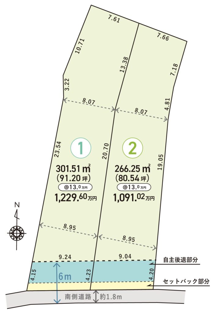 | 設備 | 上水道、電気、プロパンガス | 道路 | 南側1.8m公道(セットバック部分・自主後退部分あり) |