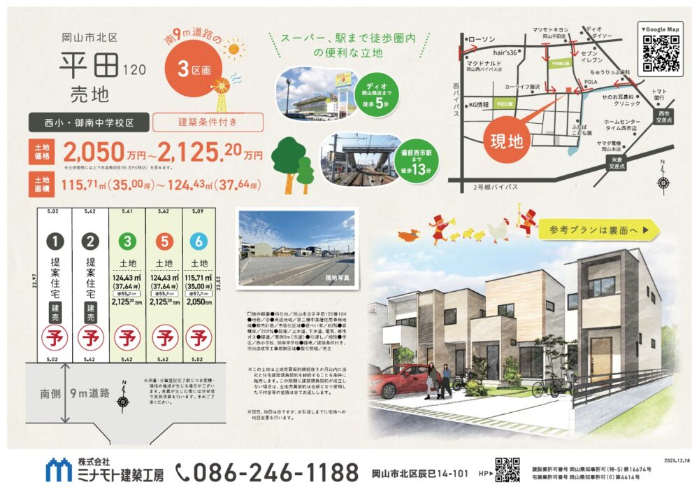 | 備考 | ※測量・分筆登記完了前につき面積・価格の増減が生じる場合がございます。差異が生じた際には坪単価で実測清算を行います。予めご了承ください。 ※現在、地目は田ですが、お引渡しまでに宅地への地目変更を行います。 ※宅地造成等工事規制区域 ◎建物参考プランの詳細は下記PDFチラシをご覧ください。 |