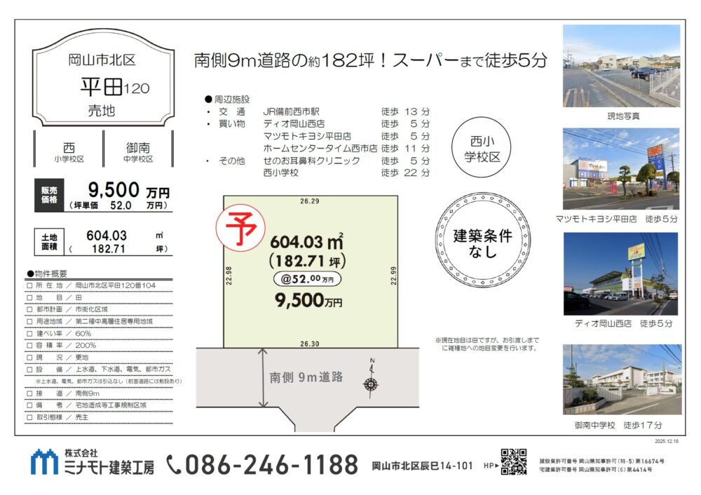 約182坪の広々敷地!!南9m道路。店舗やクリニック等にもおすすめの立地です。《建築条件なし》