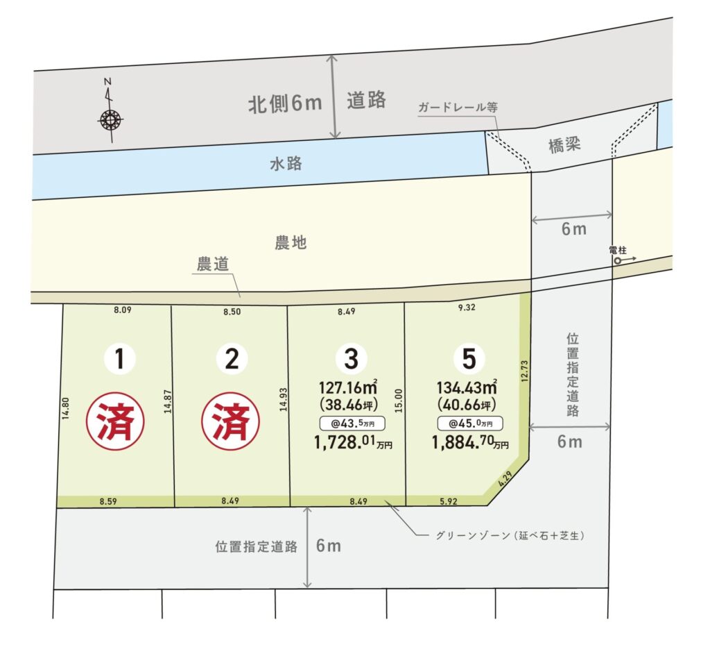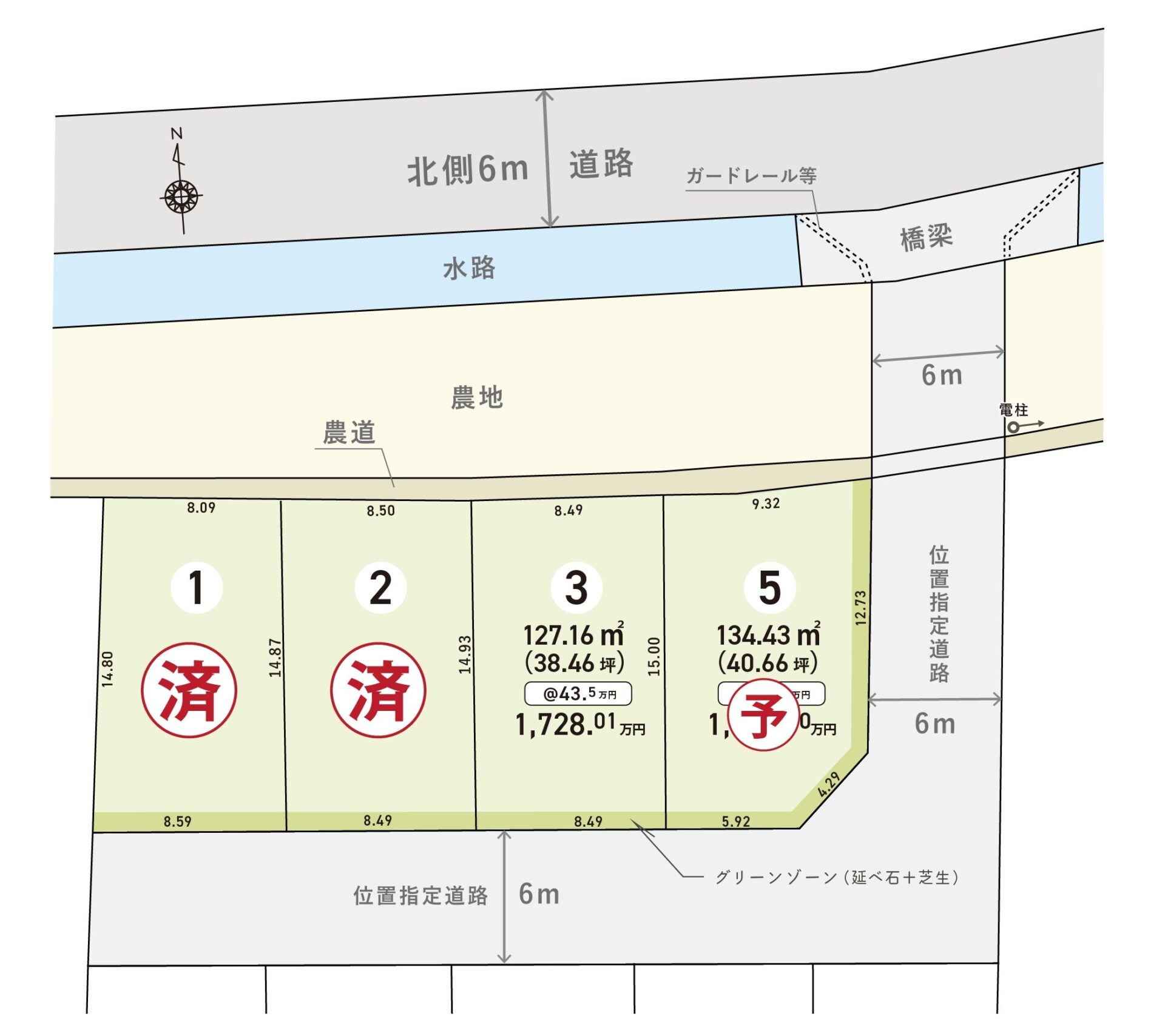 | 設備 | 上水道、下水道、電気、都市ガス | 道路 | 北側6m(団地接道)、南側6m(位置指定道路) |
