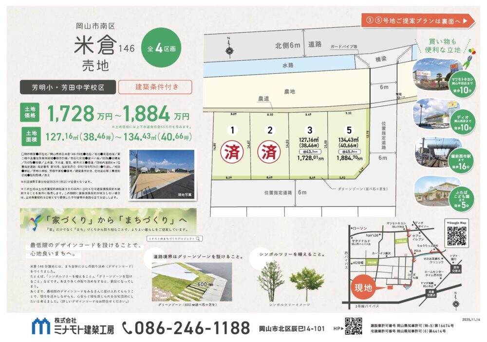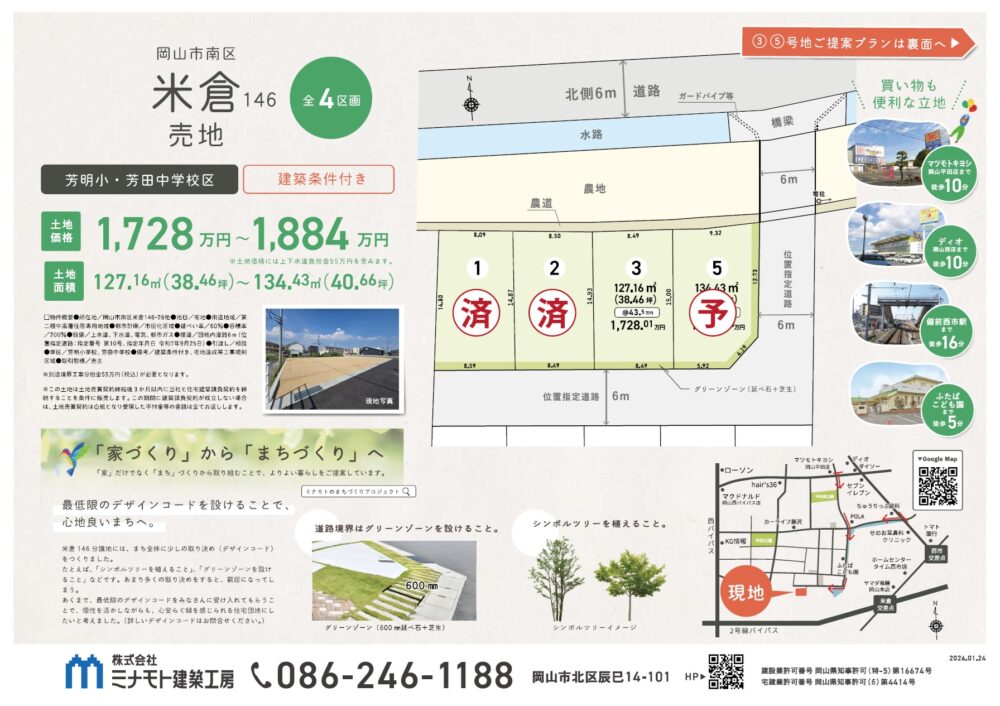 | 備考 | ・宅地造成等工事規制区域 ・建物プランは一例です。ご要望に合わせて一邸一邸プランいたします。 【最低限のデザインコードを設けることで、心地良いまちへ】 こちらの分譲地には、まち全体に少しの取り決め(デザインコード) をつくりました。 例えば、「シンボルツリーを植えること」、「グリーンゾーンを設けること」などです。最低限のデザインコードをみなさんに受け入れてもらうことで、個性を活かしながらも、心安らぐ緑を感じられる住宅団地にしたいと考えました。(詳しいデザインコードはお問合せください。) ▶もっと詳しく【まちづくりプロジェクト】 |