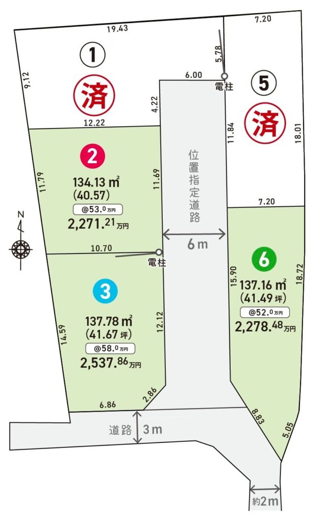 | 設備 | 上水道、下水道、電気、プロパンガス(一部都市ガス可) | 道路 | 各区画6m(位置指定道路/指定番号 第8号、指定年月日 令和7年8月6日) |