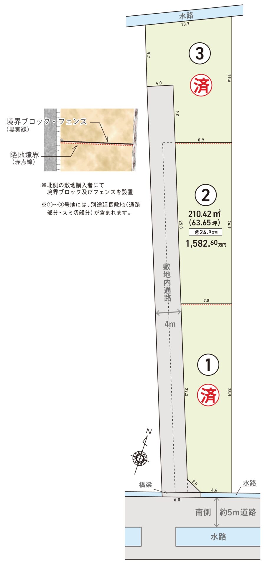 ・境界ブロック及びフェンスは北側の敷地購入者にて設置となります