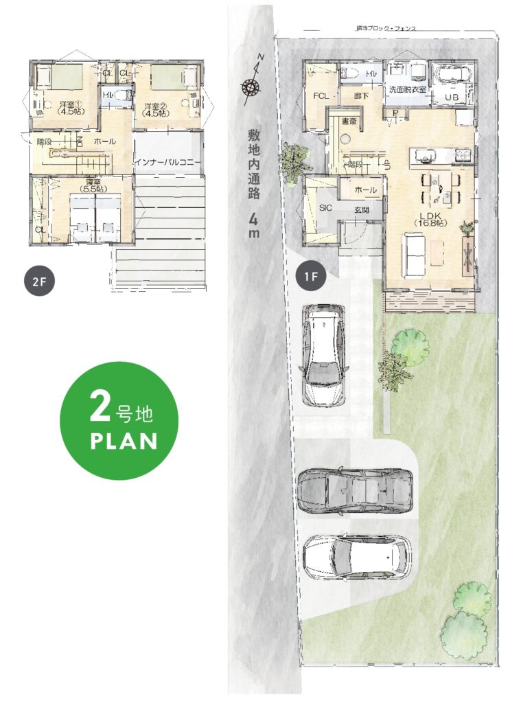 【2号地建物参考プラン・平面図】土地面積/210.42㎡(63.65坪)、建物面積/90.25㎡(27.30坪)