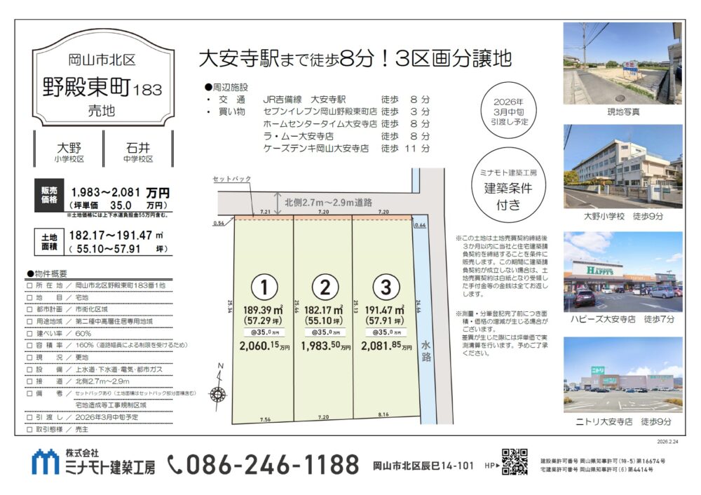 | 備考 | ※建築条件付き ※測量・分筆登記完了前につき面積・価格の増減が生じる場合がございます。差異が生じた際には坪単価で実測清算を行います。予めご了承ください。 ・セットバックあり(土地面積はセットバック部分面積含む) ・宅地造成等工事規制区域 ・2026年3月中旬引渡し予定 |