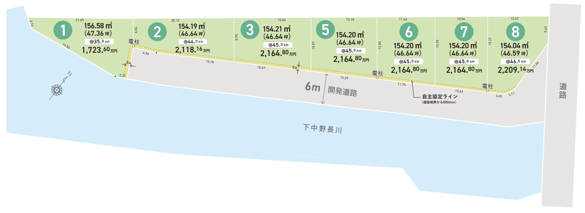 | 設備 | 上水道、下水道、電気、都市ガス | 道路 | 各号地幅員6m開発道路 |