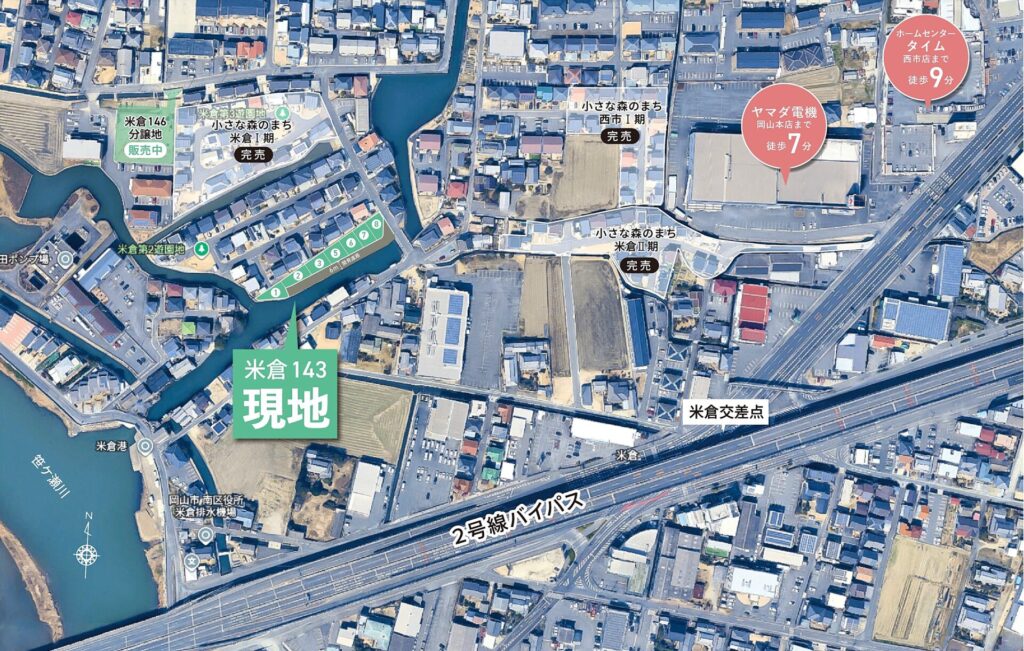 岡山市南区米倉に、全7区画の新しい分譲地が誕生!ヤマダ電機(徒歩7分)、タイム(徒歩9分)、ディオ(徒歩10分)など、大型店舗が徒歩圏内に集結していて買い物も困りません。