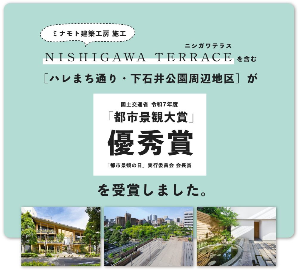 当社が2024年に施工させていただいた「NISHIGAWA TERRACE(ニシガワテラス)」を含む、[ハレまち通り・下石井公園周辺地区]が「令和7年度 都市景観大賞」(主催:国土交通省)の優秀賞を受賞しました!