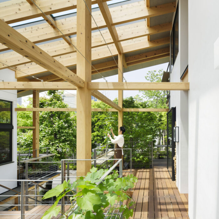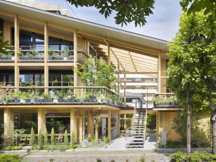 豊かな水と緑に恵まれた西川の景観に調和し、街の中でありながら森を身近に感じることができる木構造を採用した建物。