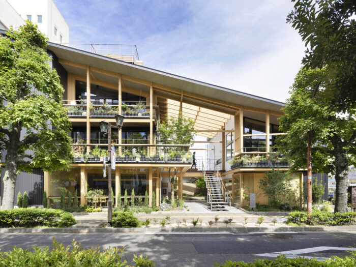 岡山市中心部、⻄川緑道公園に面する場所にある、都市と自然の循環を体現とする建築で、内外装及び構造材には岡山県産木材を使用しています。