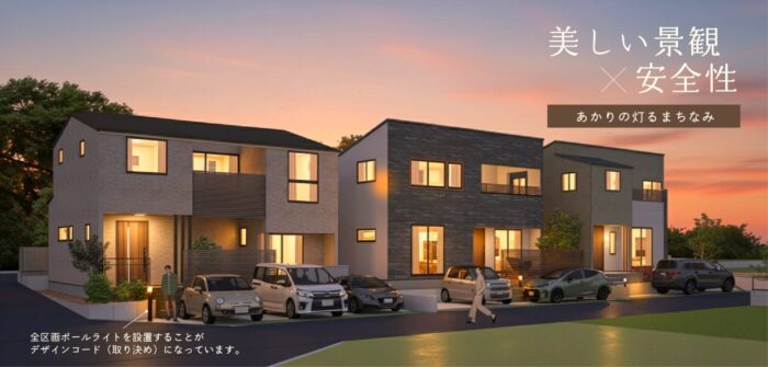 また、全区画ポールライトが夜道を優しく照らし、防犯性を高めます。分譲地内の6mの広い道路は、車の出し入れも離合もスムーズです。