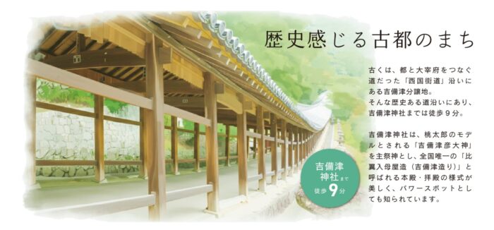 吉備津神社まで徒歩9分。歴史ある参道は、最高の散歩コース。四季の移ろいを感じながら、お子様の豊かな感性を育む環境がここにあります。