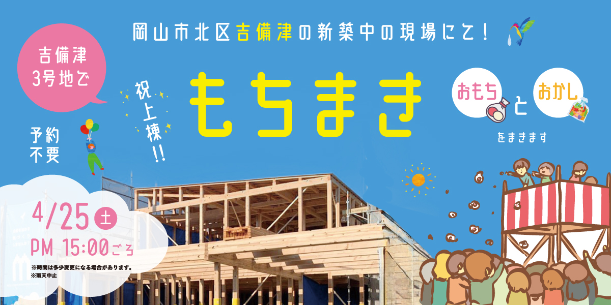 岡山市北区吉備津の現場にて、『もちまき』を行います。