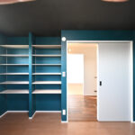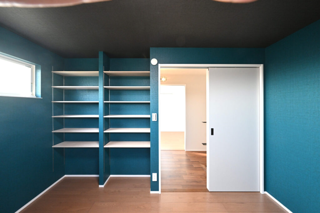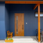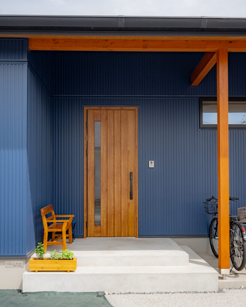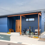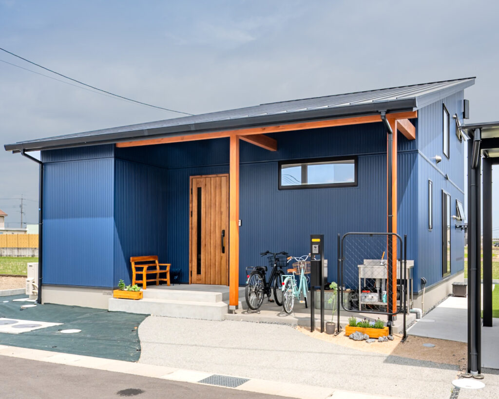 まるで平屋のような平たくスタイリッシュな形状に、ネイビーブルーのネオスパンの外壁が目を引くO様邸。