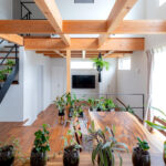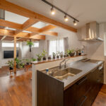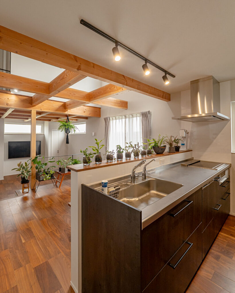 外壁には、金属サイディングを採用し無骨さを出しつつ木の柱、梁を見せることによってどこか暖かさを感じるようにしています。