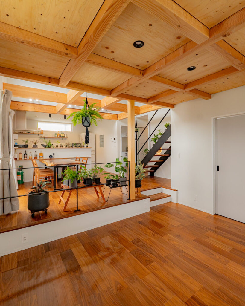 リビング空間の床を下げ、そこに2Fを乗せることで高さを押さえているため、