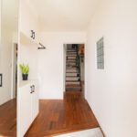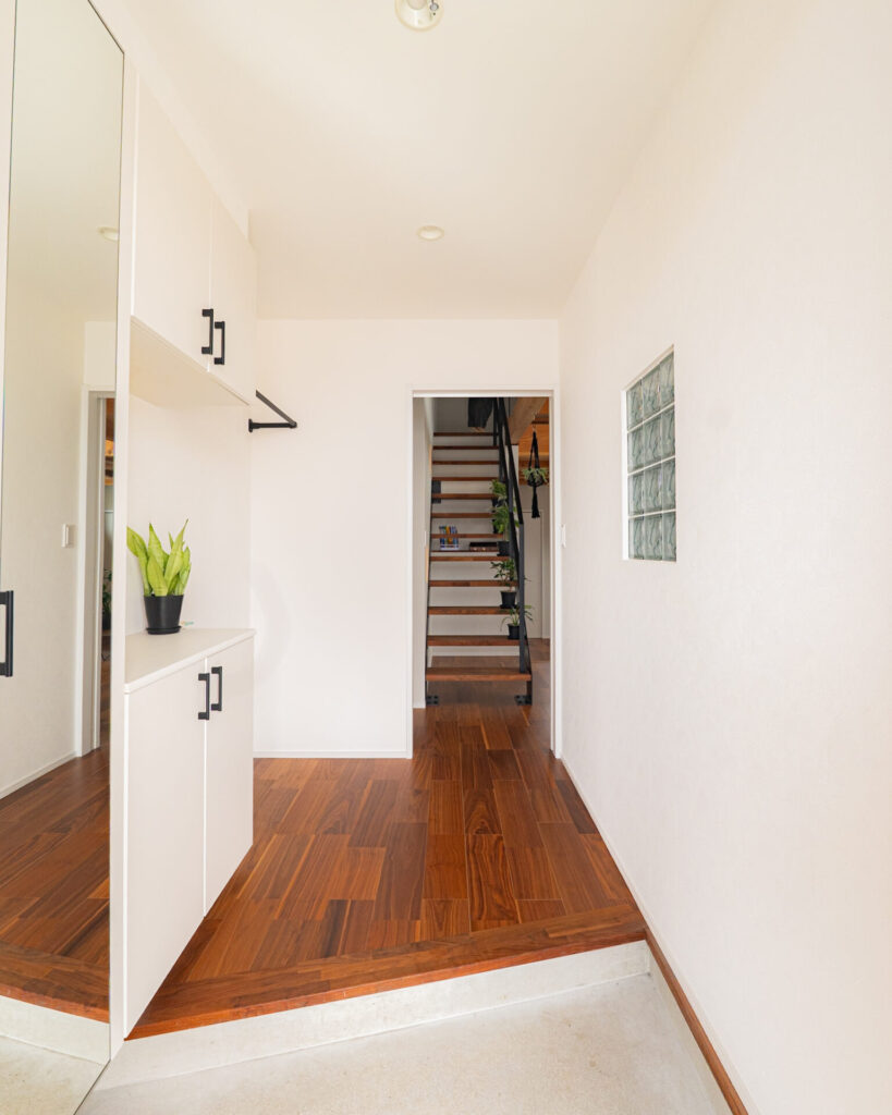 内観は玄関ホールを抜けると、奥に向かって吹き抜けていく勾配天井。吹き抜けの先には、スクエア窓を配置し、南の光がLDKに差し込みます。