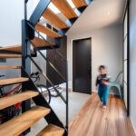 玄関を入ってまず目を引くのは、軽やかでスタイリッシュな鉄骨の回り階段。視線が抜けるデザインは空間を広く見せ、インテリアの主役として住まい全体をモダンな印象に格上げしてくれます。