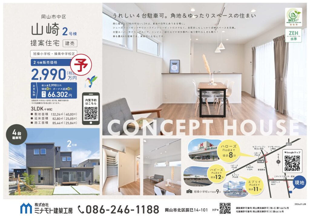 | 備考 | 【高い断熱性能で一年中快適に!】 ◆BELS☆3 ◆ZEH水準 【暮らしをサポートする充実仕様】 ◇高効率給湯器 ◇食器洗い乾燥機 ◇IHクッキングヒーター ◇浴室換気乾燥機 ◇全居室LED照明・カーテン付 ◇エアコン1台付 ※土地面積は隅切面積を含みます。 ※隅切部分は通行地役権設定。 ※屋外広告物条例(第1種) ※宅地造成等工事規制区域 ★月々のお支払い6.6万円~(詳しくは下記PDFチラシをご覧ください) ★同分譲地内①⑤号棟もあわせて内覧できます。(下記リンクより) https://www.ie-miru.jp/cms/yoyaku/minamoto/events/81970 |