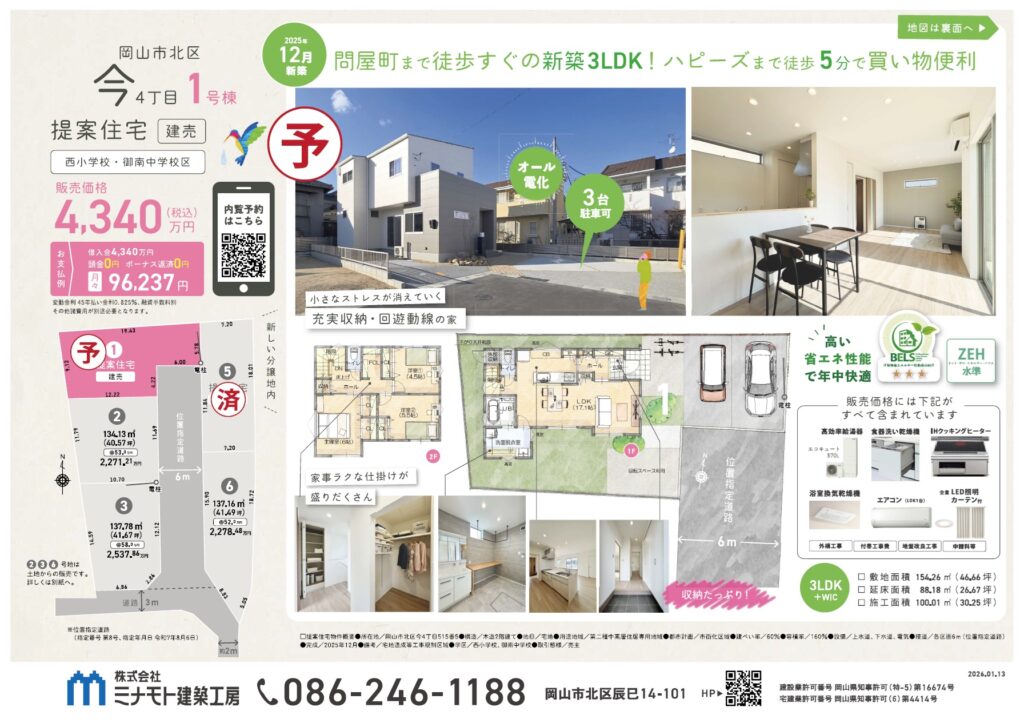 | 備考 | ※宅地造成等工事規制区域 ※位置指定道路(指定番号 第8号、指定年月日 令和7年8月6日) 同分譲地内②③⑥号地は土地からの販売です。お気軽にお問い合わせください。 【下記から内覧予約できます】 https://www.ie-miru.jp/cms/yoyaku/minamoto/events/111898 |