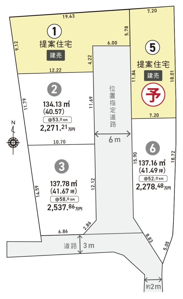 | 備考 | ※宅地造成等工事規制区域 ※位置指定道路(指定番号 第8号、指定年月日 令和7年8月6日) 同分譲地内②③⑥号地は土地からの販売です。お気軽にお問い合わせください。 |