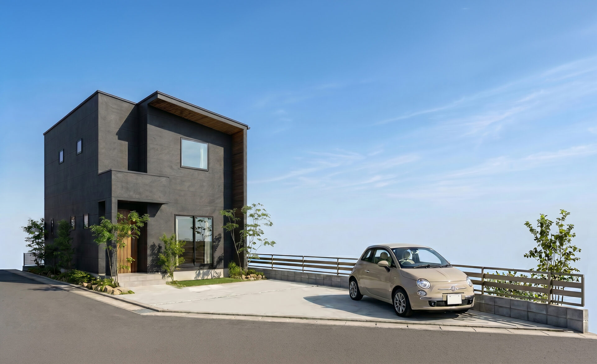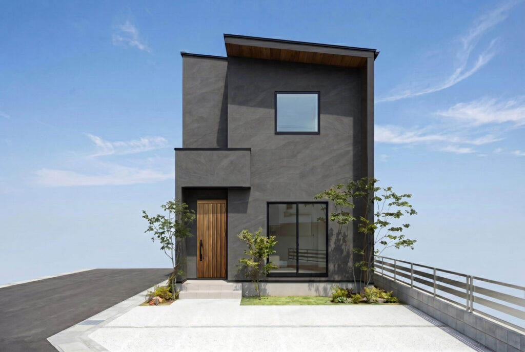 【外観(南西側)】片流れ屋根や、黒×木調の外壁でモダンな雰囲気の外観