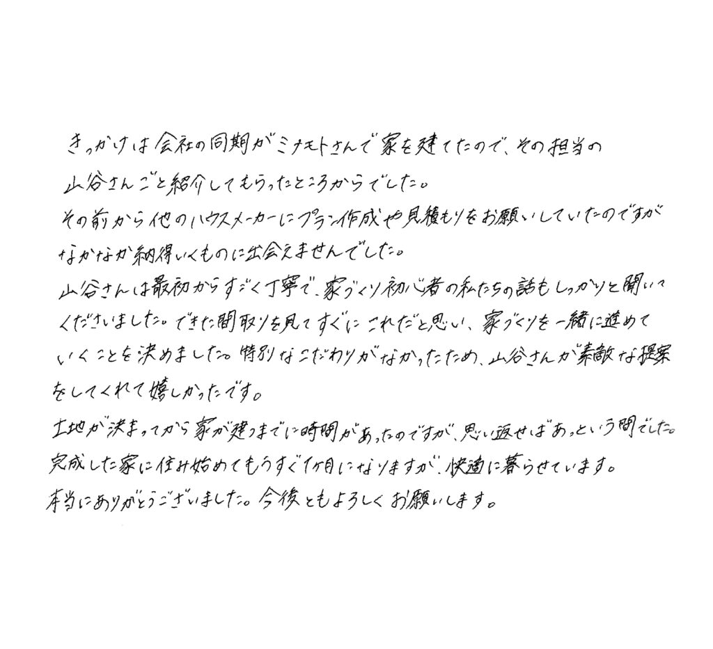 きっかけは会社の同期がミナモトさんで家を建てたので、その担当の山谷さんごと紹介してもらったところからでした。