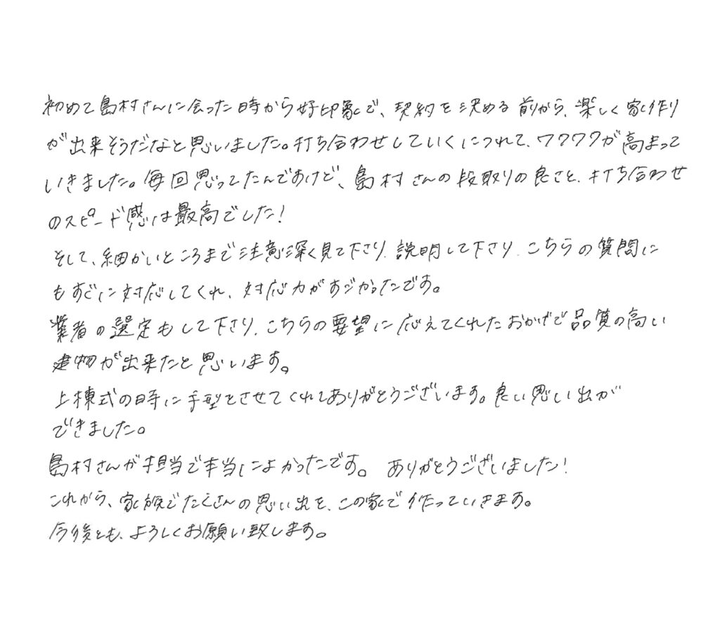 初めて(ハウスプランナーの)島村さんに会った時から好印象で、契約を決める前から、楽しく家作りが出来そうだなと思いました。