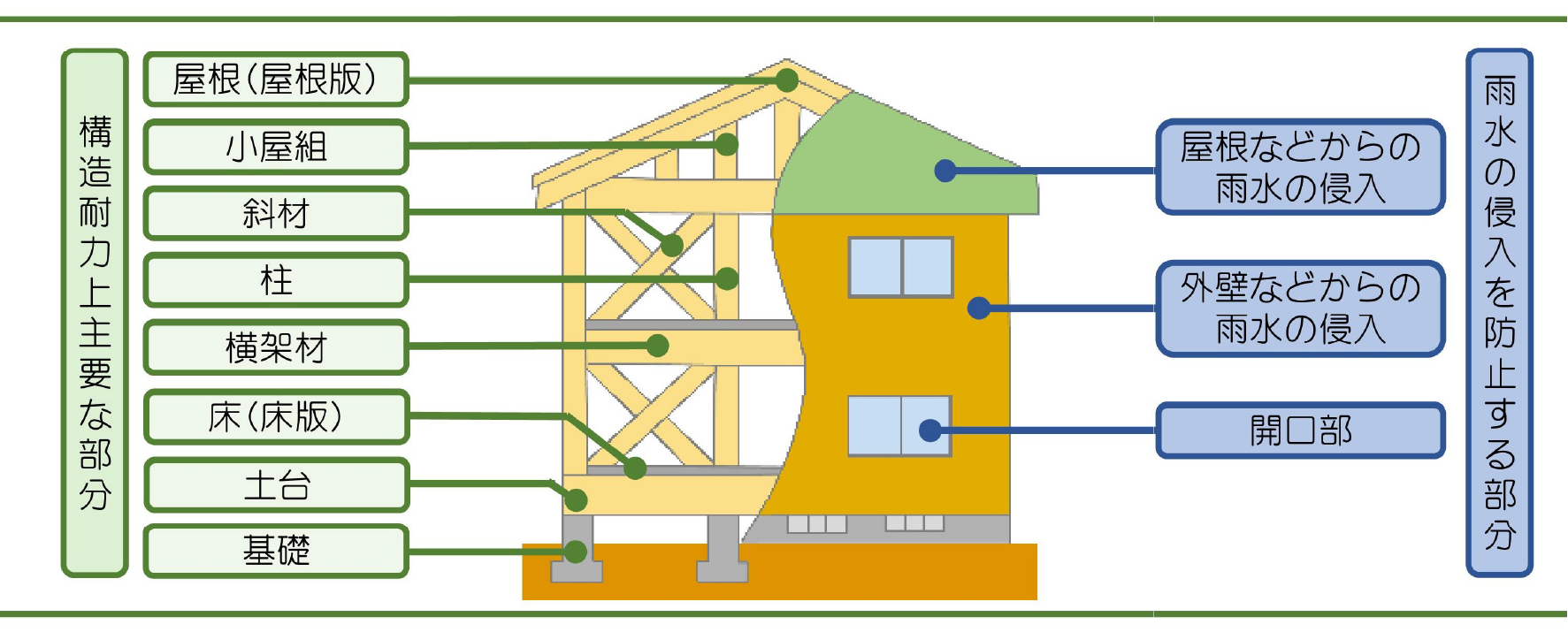 基本構造部分である構造耐力上主要な部分および雨水の侵入を防止する部分で新築工事の不具合があった場合、修補工事が保証対象となります。